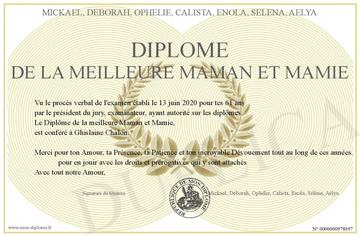 Envoyez par email votre Diplôme de la meilleure maman et mamie personalisé