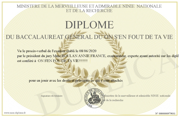 Envoyez par email votre Diplôme du baccalaureat général du on s'en fout de ta vie personalisé