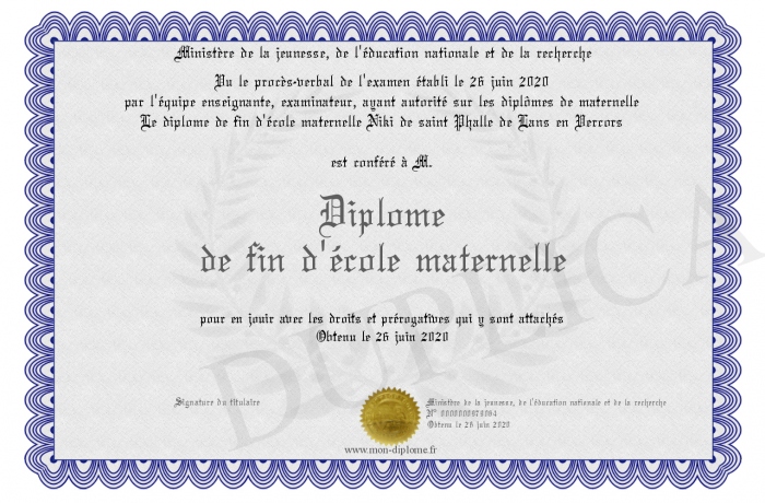 Envoyez par email votre Diplôme de fin d'école maternelle personalisé