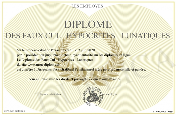 Envoyez par email votre Diplôme des Faux Cul Hypocrites Lunatiques personalisé
