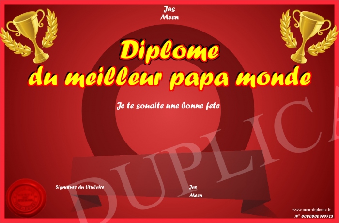 Envoyez par email votre Diplôme du meilleur papa monde personalisé