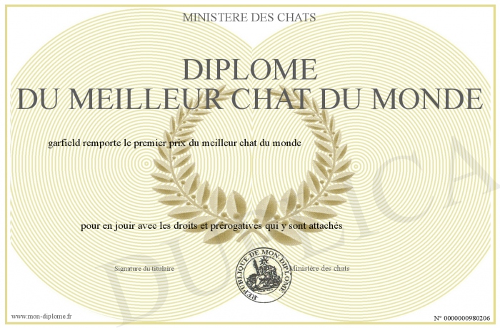 Envoyez par email votre Diplôme du meilleur chat du monde personalisé