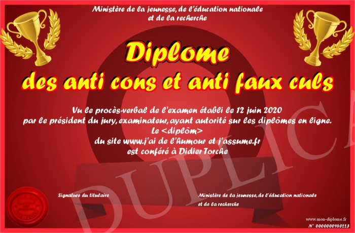 Envoyez par email votre Diplôme des anti cons et anti faux culs personalisé