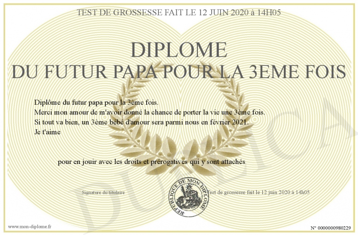 Envoyez par email votre Diplôme du futur papa pour la 3ème fois personalisé