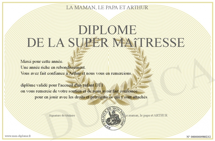 Envoyez par email votre Diplôme de la super maîtresse personalisé