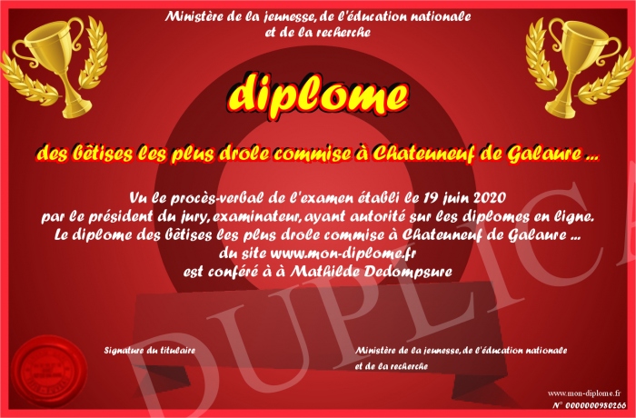 Envoyez par email votre diplome des bêtises les plus drôle commise à Chateuneuf de Galaure ... personalisé