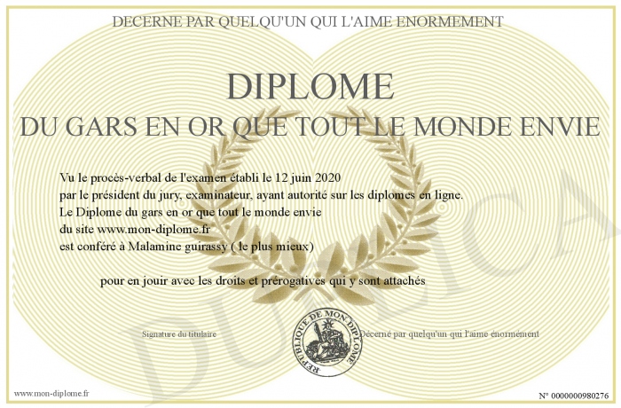 Envoyez par email votre Diplôme du gars en or que tout le monde envie personalisé