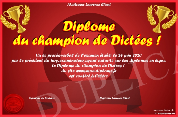 Envoyez par email votre Diplôme du champion de Dictées ! personalisé