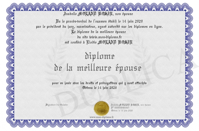 Envoyez par email votre diplôme de la meilleure épouse personalisé