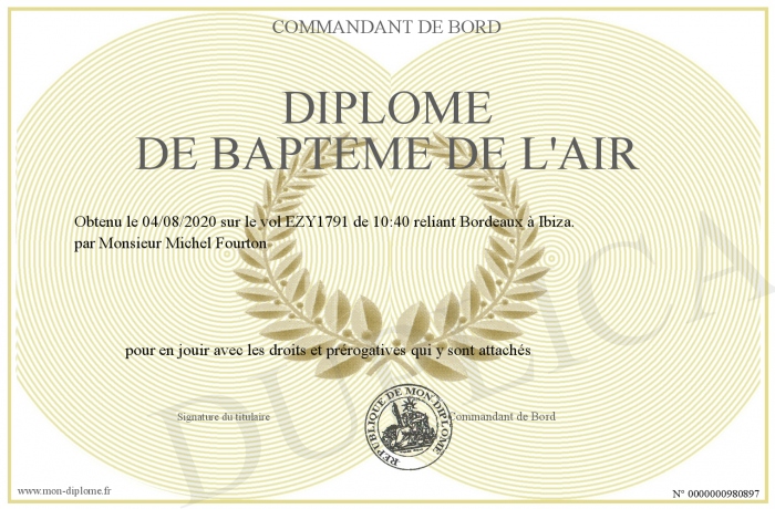 Envoyez par email votre Diplôme de bapteme de l'air personalisé