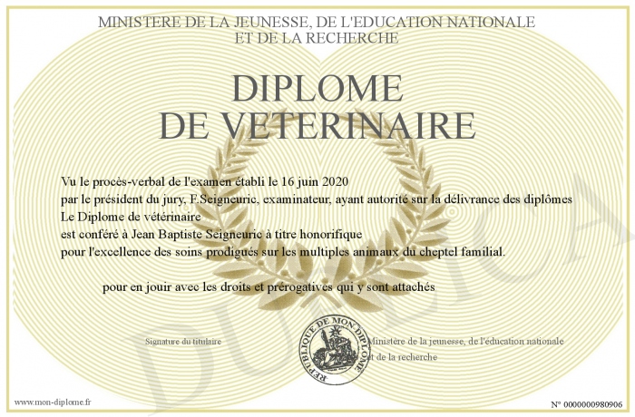 Envoyez par email votre Diplôme de vétérinaire personalisé