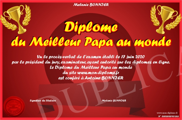 Envoyez par email votre Diplôme du Meilleur Papa au monde personalisé