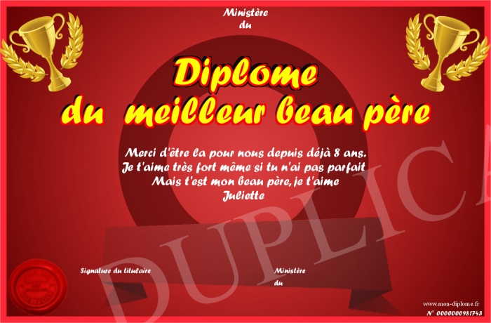 Envoyez par email votre Diplôme du meilleur beau père personalisé