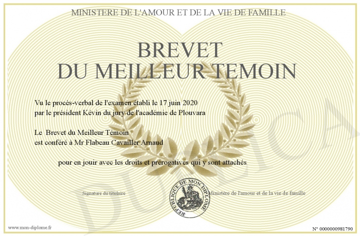 Envoyez par email votre Brevet du Meilleur Témoin personalisé
