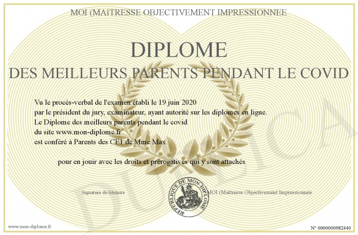 Envoyez par email votre Diplôme des meilleurs parents pendant le covid personalisé