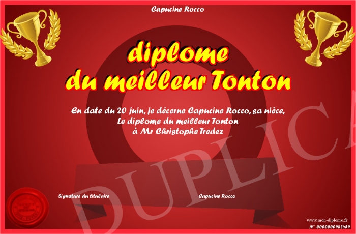 Envoyez par email votre diplôme du meilleur Tonton personalisé