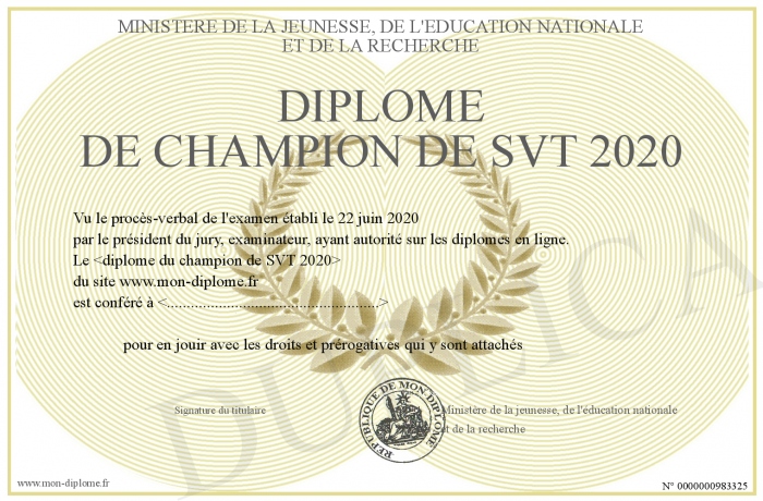 Envoyez par email votre Diplôme de champion de SVT 2020 personalisé