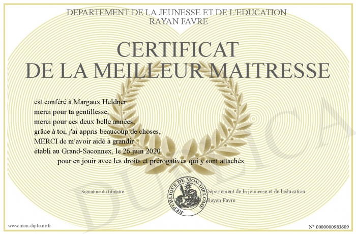 Envoyez par email votre Certificat de la meilleur maitresse personalisé