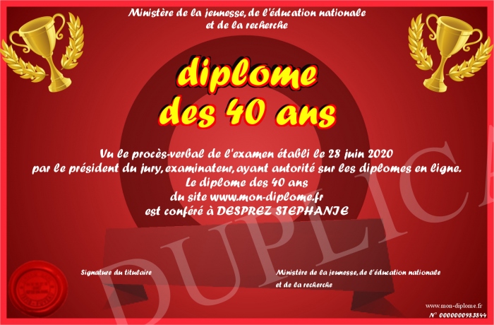Envoyez par email votre diplome des 40 ans personalisé