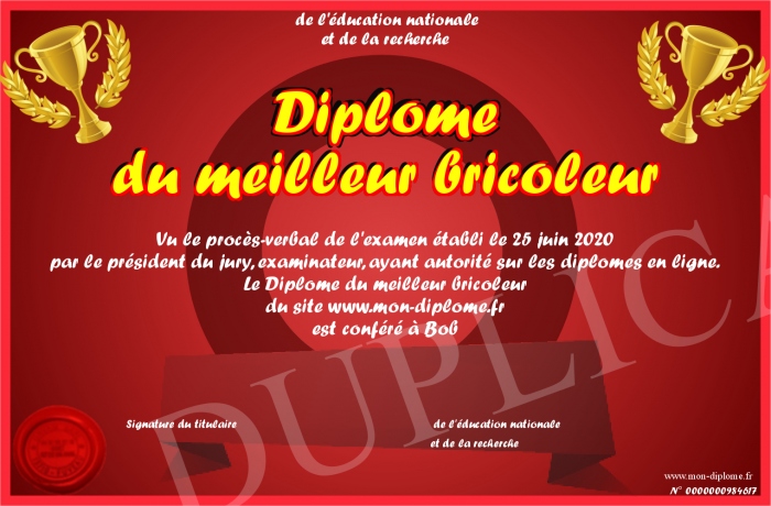 Envoyez par email votre Diplôme du meilleur bricoleur personalisé