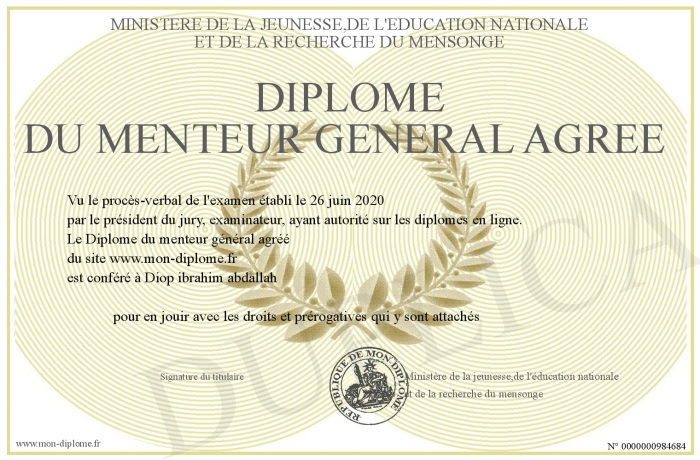 Envoyez par email votre Diplôme du menteur général agréé personalisé