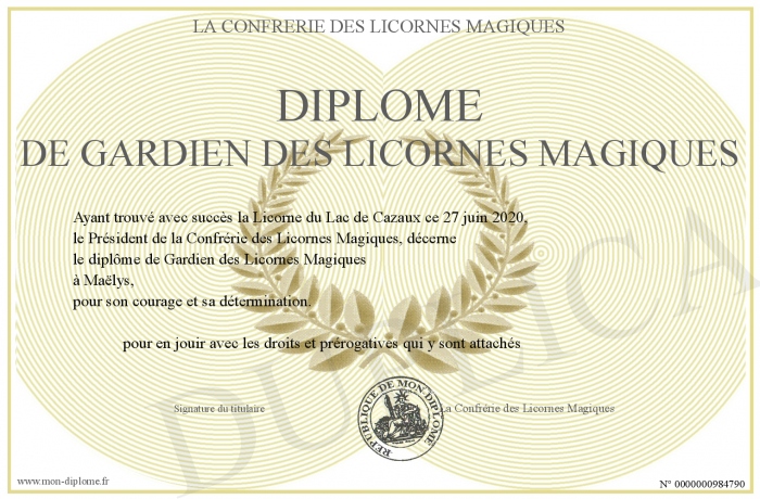 Envoyez par email votre diplôme de gardien des licornes magiques personalisé