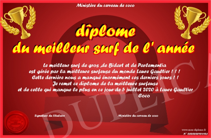 Envoyez par email votre dîplome du meilleur surf de l' année personalisé
