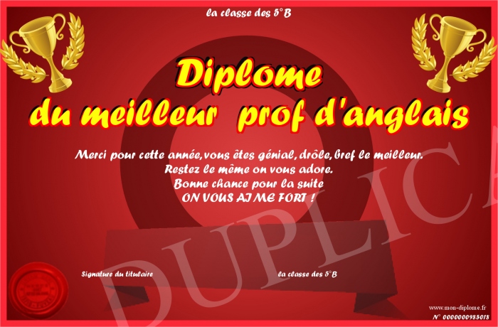 Envoyez par email votre Diplôme du meilleur prof d'anglais personalisé
