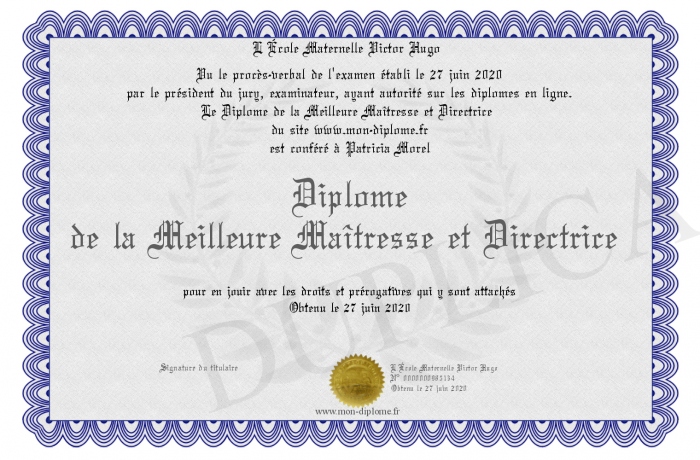 Envoyez par email votre Diplôme de la Meilleure Maîtresse et Directrice personalisé
