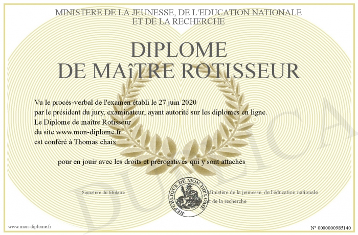 Envoyez par email votre Diplôme de maître Rotisseur personalisé