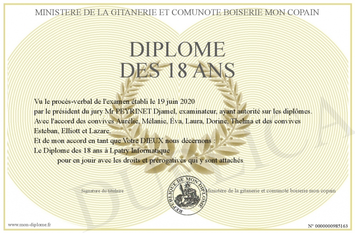 Envoyez par email votre Diplôme des 18 ans personalisé