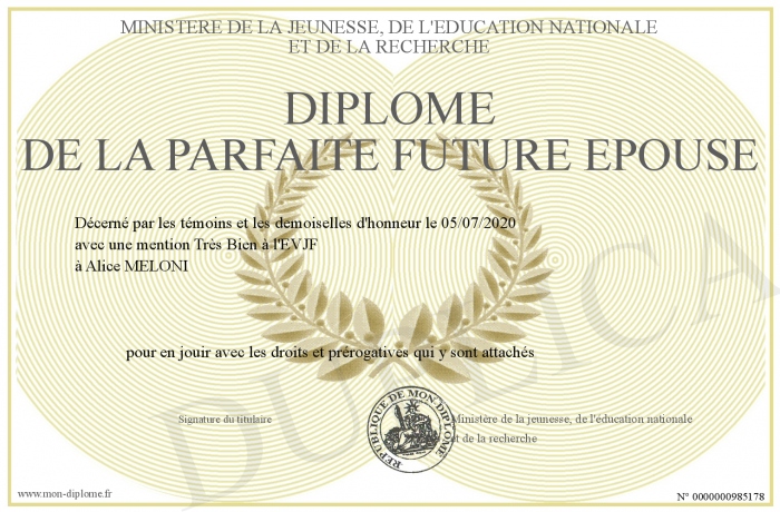 Envoyez par email votre Diplôme de la parfaite future épouse personalisé