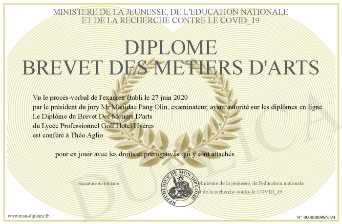 Envoyez par email votre Diplôme Brevet des Métiers d'Arts personalisé