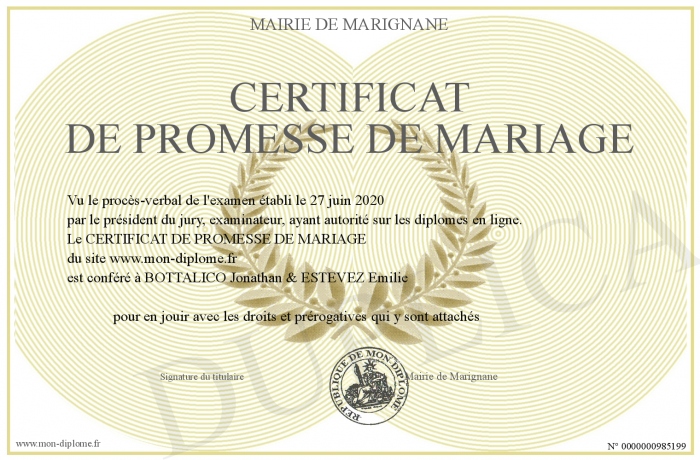 Envoyez par email votre CERTIFICAT DE PROMESSE DE MARIAGE personalisé