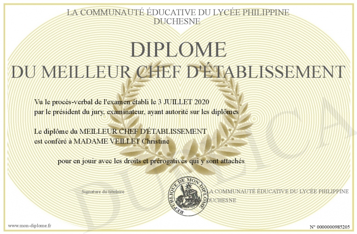 Envoyez par email votre Diplôme du MEILLEUR CHEF D'ÉTABLISSEMENT personalisé