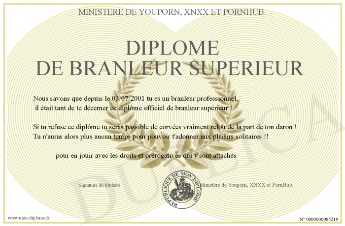 Envoyez par email votre Diplôme de branleur supérieur personalisé