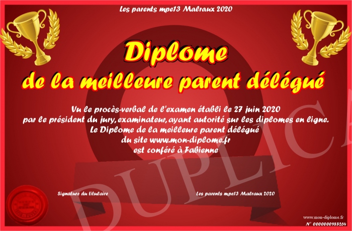 Envoyez par email votre Diplôme de la meilleure parent délégué personalisé
