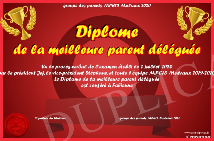 Envoyez par email votre Diplôme de la meilleure parent déléguée personalisé