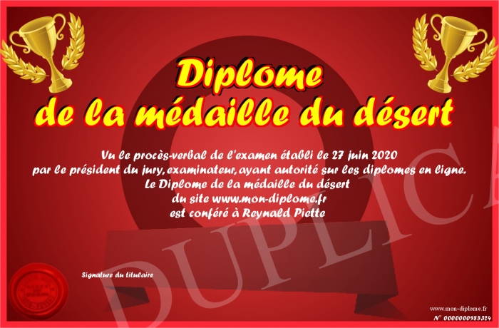 Envoyez par email votre Diplôme de la médaille du désert personalisé