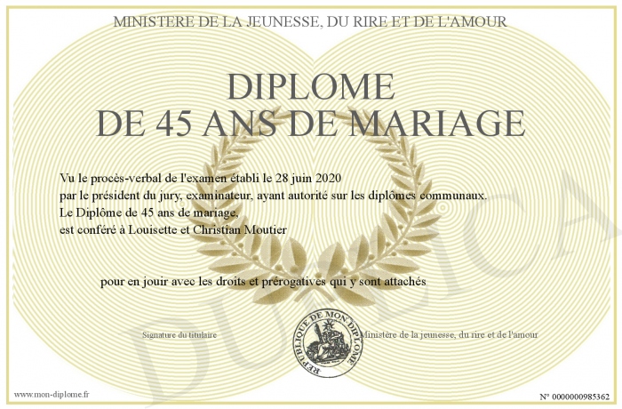 Envoyez par email votre Diplôme de 45 ans de mariage personalisé