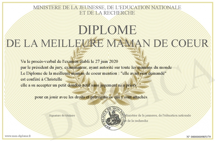 Envoyez par email votre Diplôme de la meilleure maman de coeur personalisé