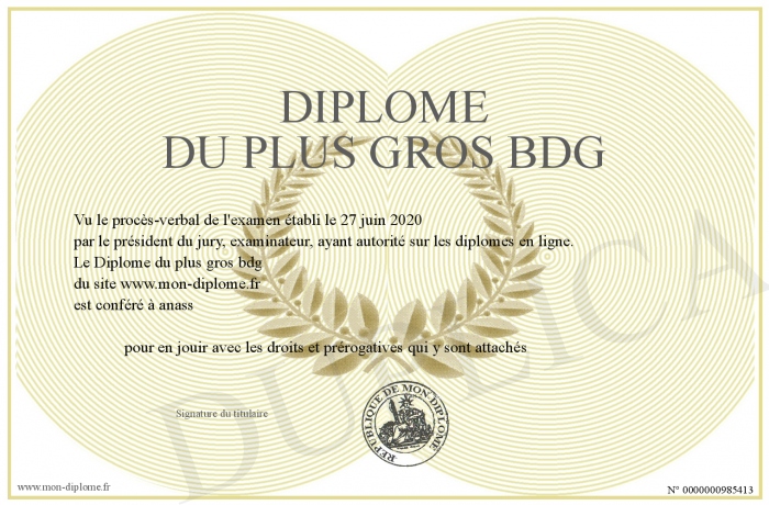 Envoyez par email votre Diplôme du plus gros bdg personalisé
