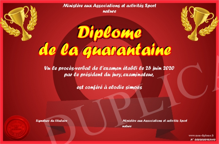 Envoyez par email votre Diplôme de la quarantaine personalisé
