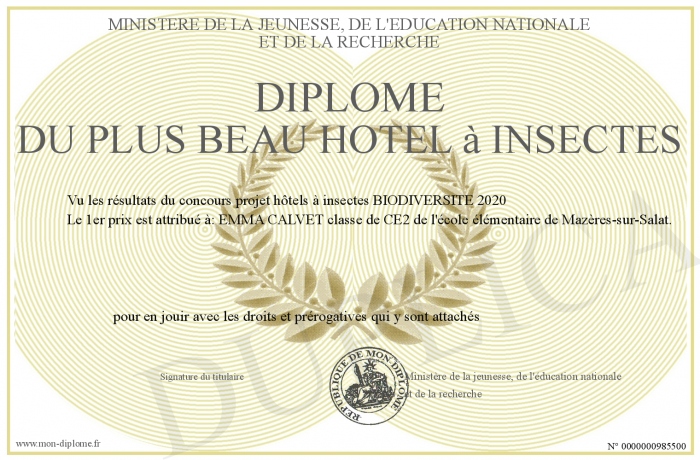 Envoyez par email votre Diplôme du plus beau hôtel à insectes personalisé