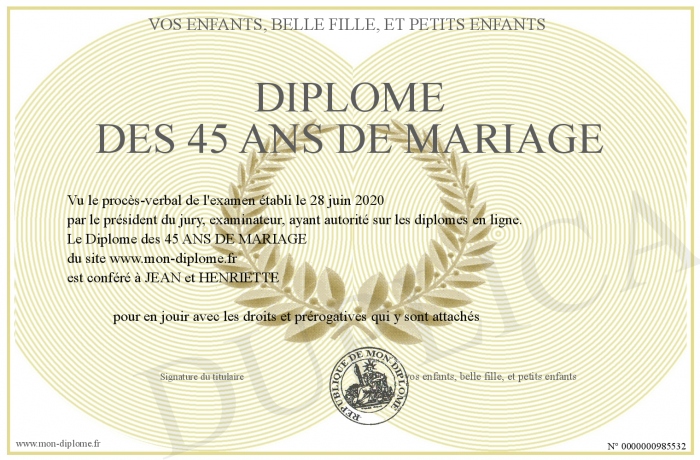 Envoyez par email votre Diplôme des 45 ANS DE MARIAGE personalisé