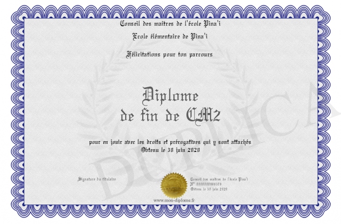 Envoyez par email votre Diplôme de fin de CM2 personalisé