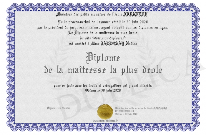 Envoyez par email votre Diplôme de la maîtresse la plus drôle personalisé