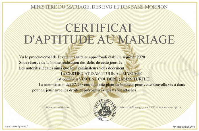 Envoyez par email votre CERTIFICAT D'APTITUDE AU MARIAGE personalisé