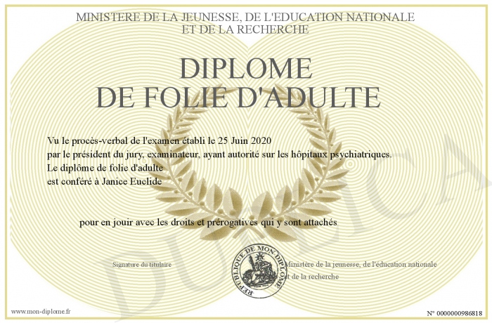 Envoyez par email votre Diplôme de folie d'adulte personalisé