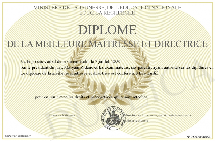 Envoyez par email votre Diplôme de la meilleure maitresse et directrice personalisé